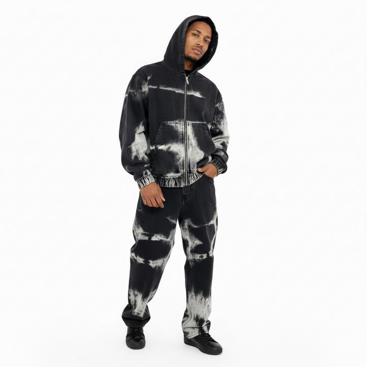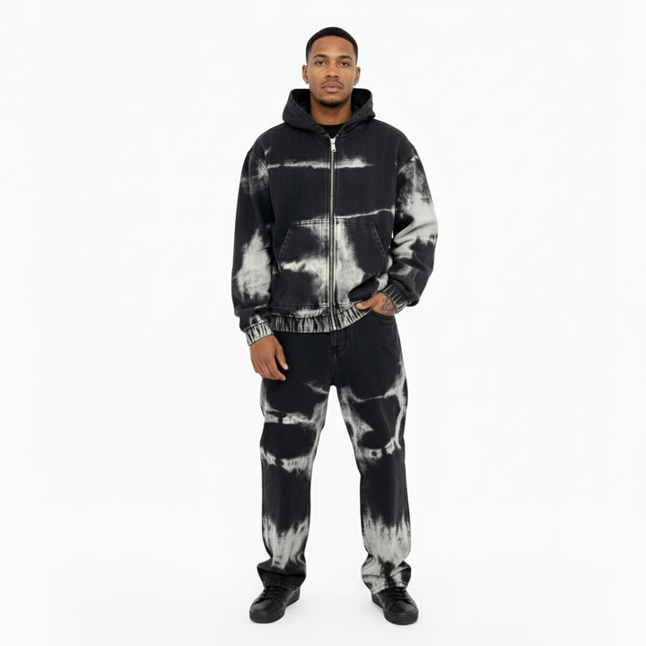 Coordinato Black Waves con cappuccio: onde grafiche che catturano lo sguardo su base nera pura. Audace, minimalista, perfetto per chi vuole fare un'affermazione senza urlare.