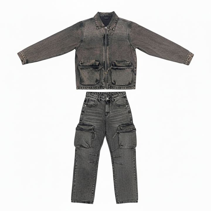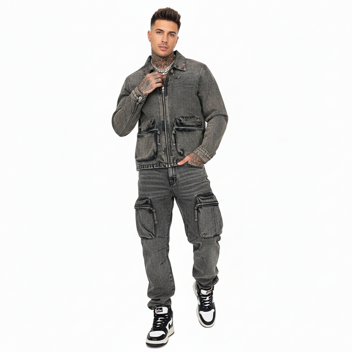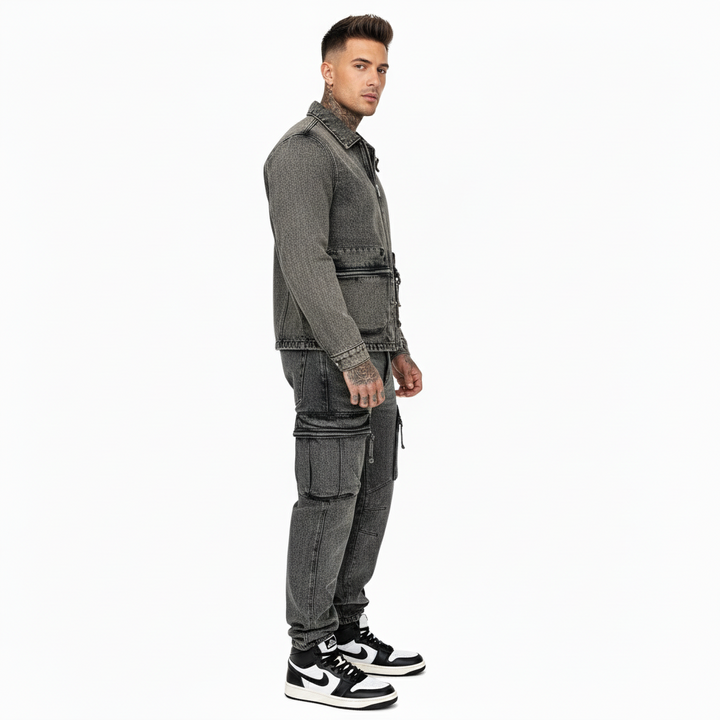 Coordinato cargo in denim che spezza le regole: tasche strategiche, fit generoso e dettagli ribelle. Stile street con l'anima del lavoro, per chi non segue le tendenze ma le crea.