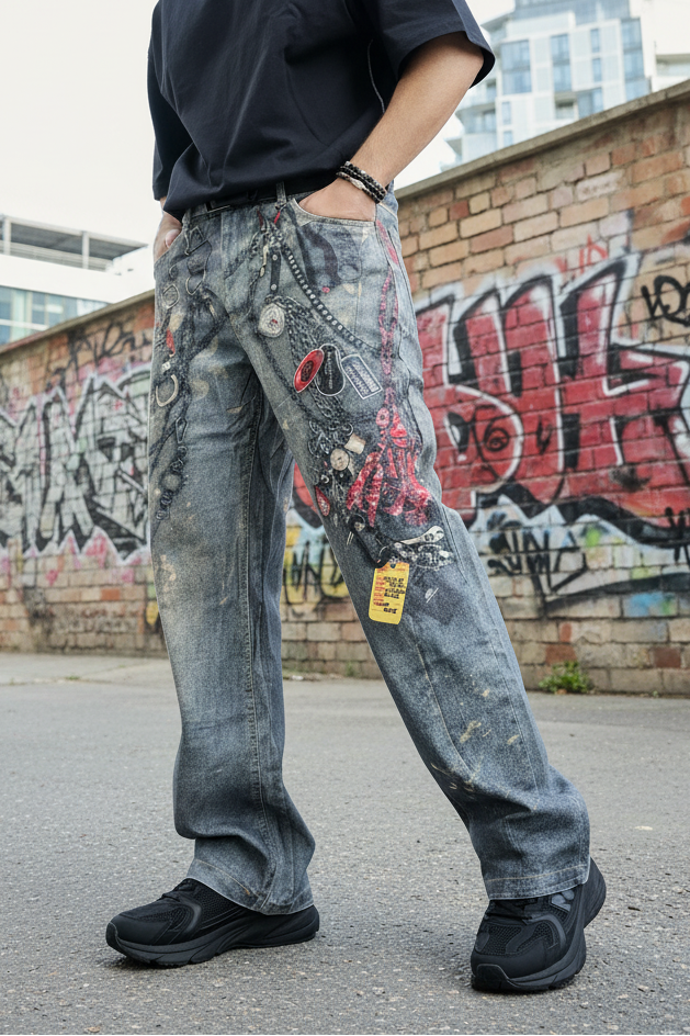 Jeans baggy con stampe catene, accessori e portachiavi effetto 3D. Look graphic vistoso con carattere.
