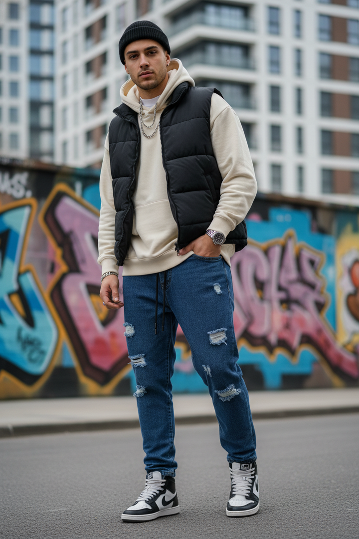 Jeans blu con elastico in vita e dettagli abrasivi per un effetto vissuto e moderno. Ideali per chi cerca un look casual e streetstyle.