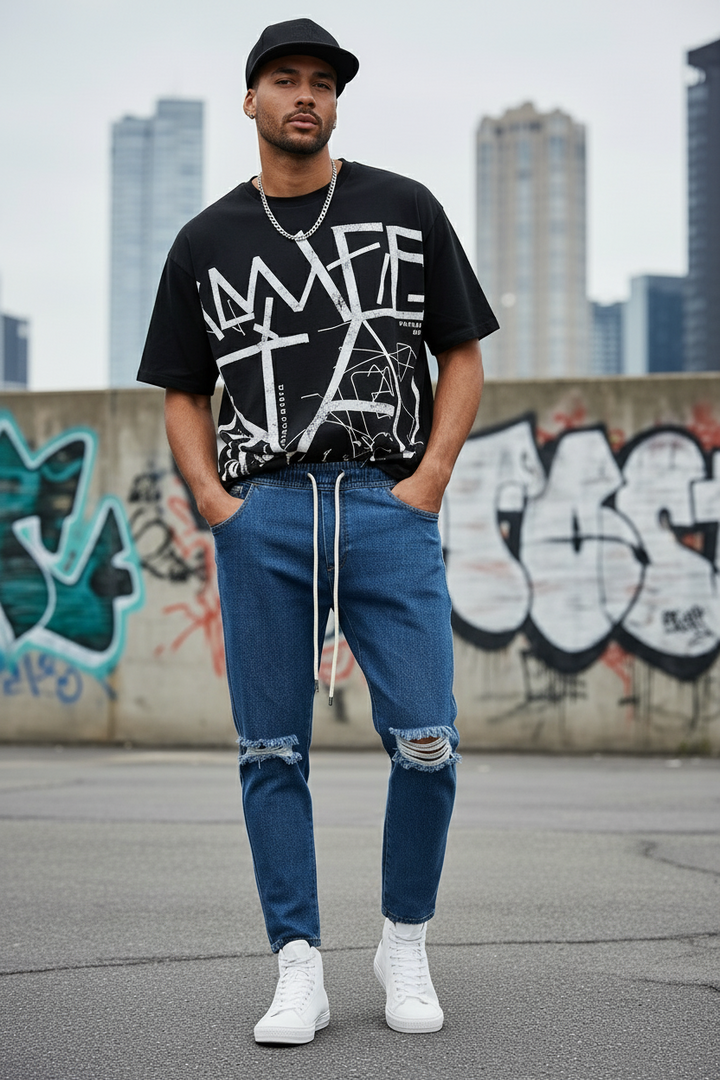 Jeans blu con elastico in vita e dettagli abrasivi per un effetto vintage moderno. Ideali per chi cerca un look casual e street style.