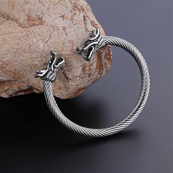 Bracciale da uomo in acciaio inox nero con design ispirato ai Vichinghi, caratterizzato da un motivo doppio drago che conferisce un aspetto potente e distintivo. Perfetto per chi ama gioielli robusti e dallo stile deciso.