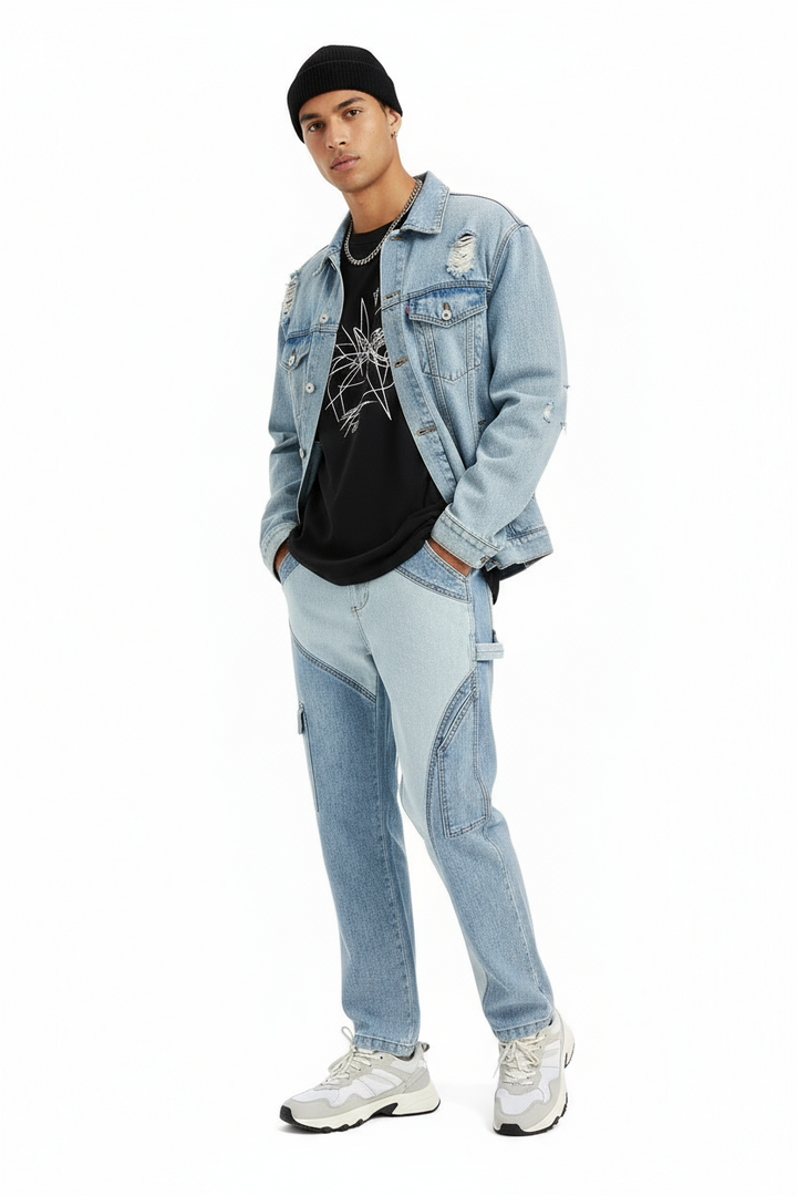 Jeans bicolore azzurro e celeste con vestibilità baggy e tasche cargo in stile carpenter. Perfetti per un look contemporaneo con carattere.