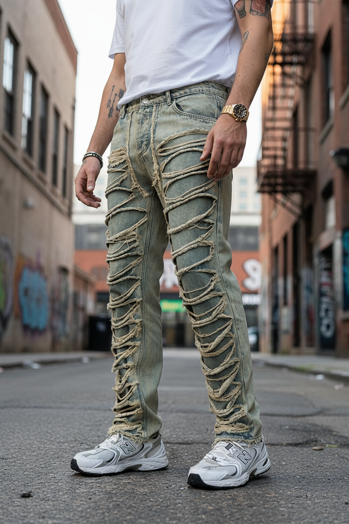 I jeans Los Angeles Cut combinano un fit baggy con rotture strategiche per un look grintoso e urbano. Il lavaggio blu vintage completa il design con un tocco rétro.