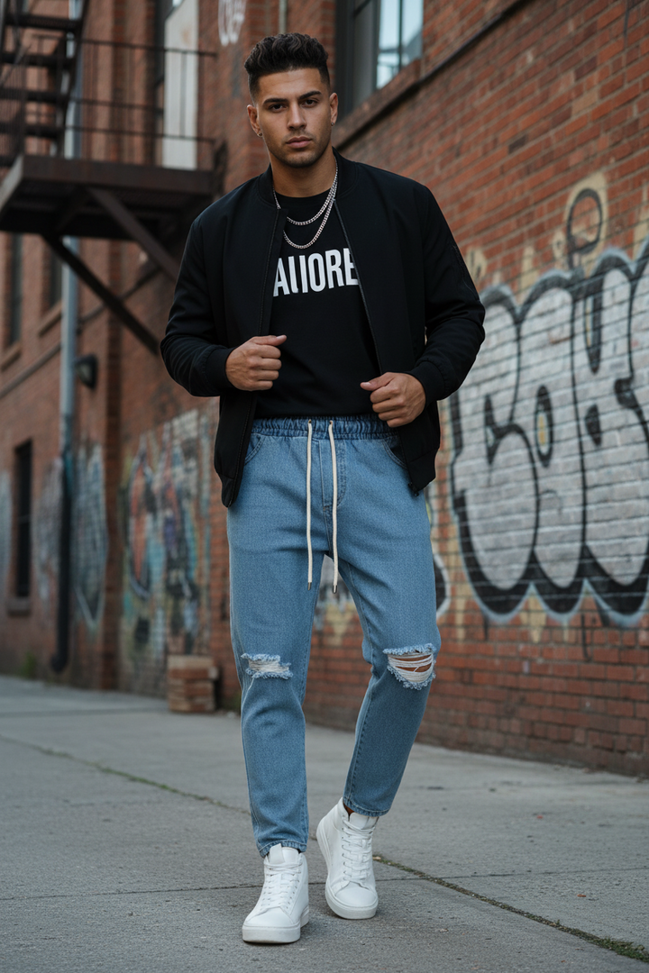 Jeans da uomo azzurro con elastico in vita e strappi alle ginocchia, perfetti per un look streetwear alla moda. Vestibilità comoda e stile casual, ideali per outfit urban.