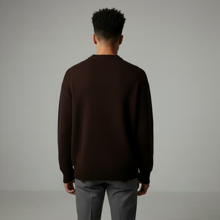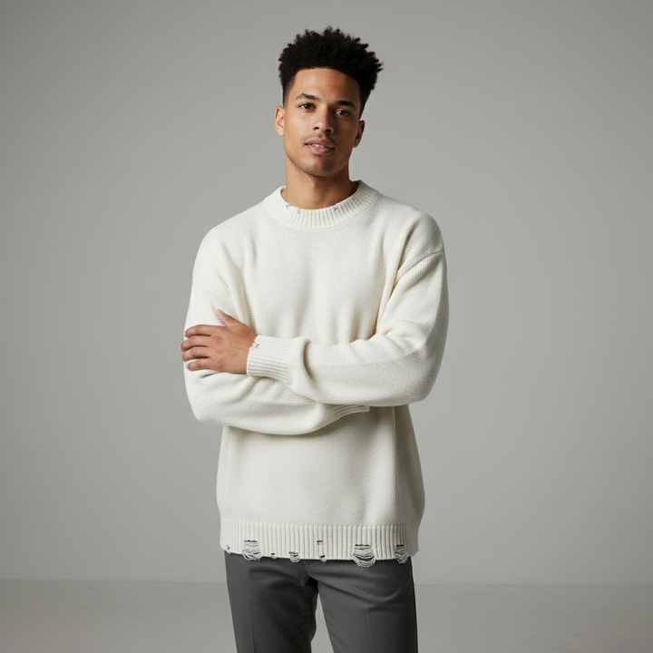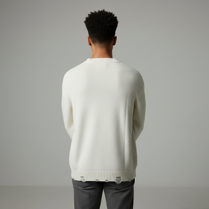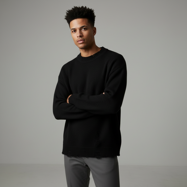 Maglione oversize con strappi audaci e tagli strategici che sfidano lo stile convenzionale. Perfetto per chi osa distinguersi, questo capo combina comfort e atteggiamento ribelle. Indossalo per un look che non passa inosservato.